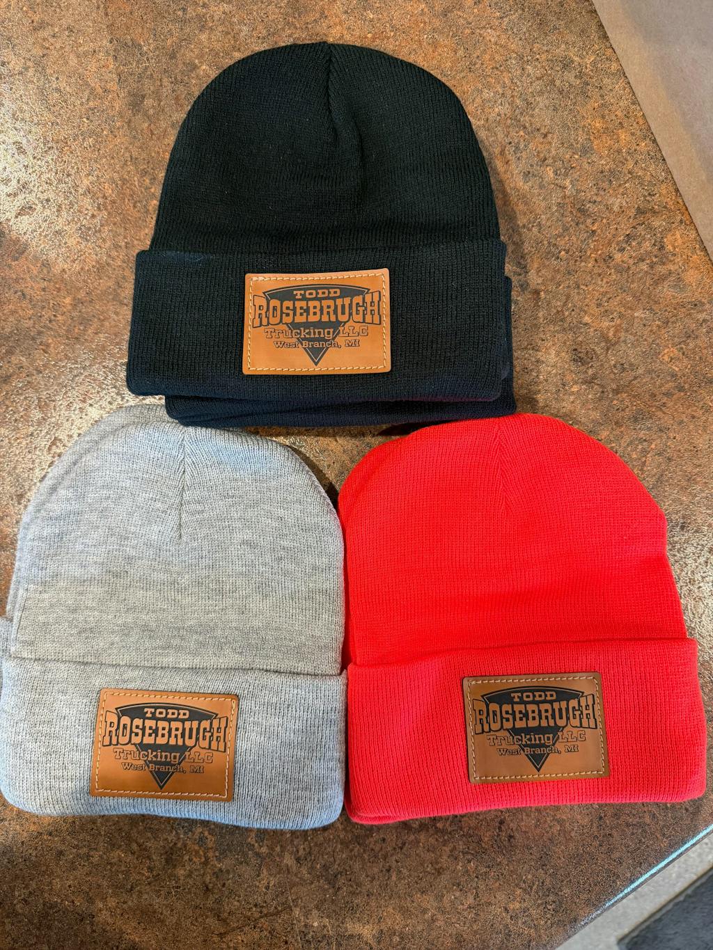 Your logo engraved on authentic bourbon-toned leather, paired with a soft, quality stocking cap.